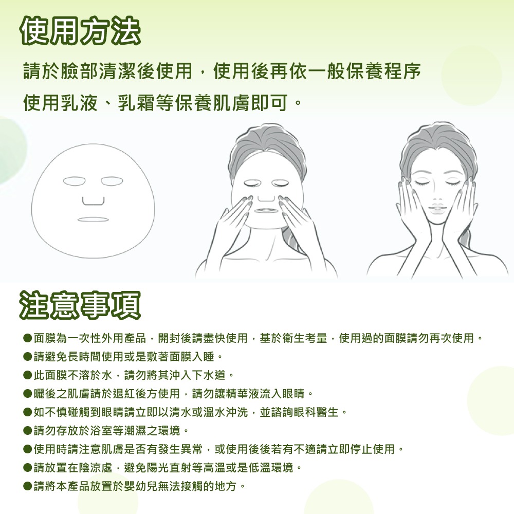 於肌膚清潔後,取出面膜平敷於臉部靜置15分鐘後取下,輕輕按摩臉部至精華液吸收即可。